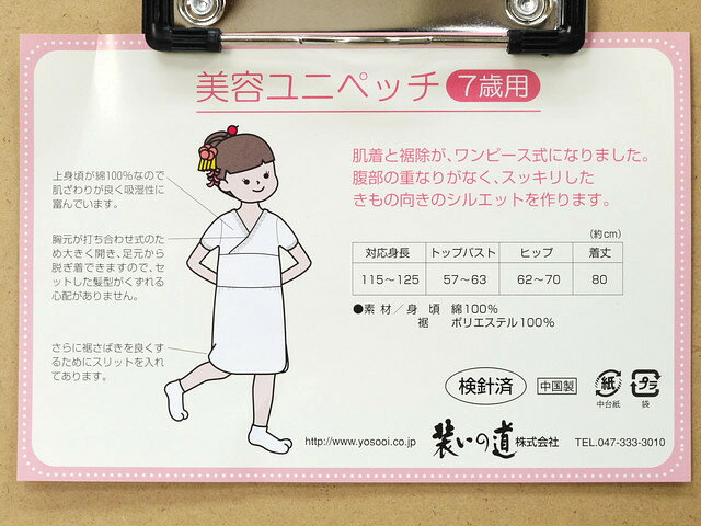 【子供7歳用ユニペッチ】 半襦袢と裾よけがワンピース式になった 装道の着物スリップ「美容ユニペッチ」 腹部の重なりがないので すっきりとしたシルエットになります! 【サイズ】 身長:115〜125cm 胸囲:57〜63cm ヒップ:62〜70cm ※商品についての詳細等気になる点がございましたらチャットやお電話でお気軽にご質問くださいませ。